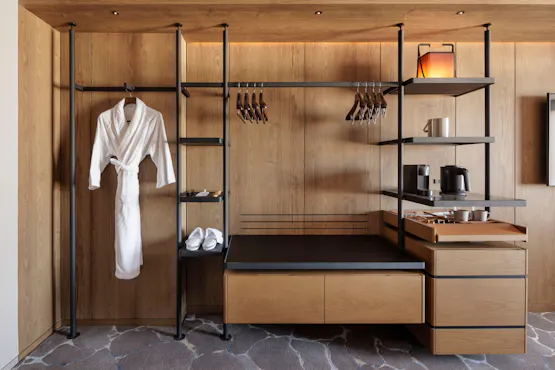 リージェンシークラブルームはチーク材を多用した落ち着いた雰囲気で、温かさの中にも風合いと質感にこだわった、シンプルでモダンな「和」のテイストが感じられます。具体的には和の内装の手法である櫛引きの塗り壁の直線的なラインや間接照明が創り出す微妙な陰影で、「和」の様式がもつ洗練された美しさを表現しています。内装デザインを担当するのは、ハイアットをはじめ国内外の国際的なトップホテルのデザインを多数手がけている、スーパーポテトの杉本貴志(すぎもと・たかし)氏。「和」の持つミニマリズムと強さを表現し、上質な居心地の良さを感じていただけます。 面積を広くとったバスルームは、居室との間の壁をガラスにすることで、深いバスタブにゆったりと体を沈めながら、窓の外の眺めや客室内のテレビも楽しめるようになりました。さらに、シャワーエリアをバスタブに隣接させた日本式のバスルームにすることで、シャワー利用時の快適性をアップさせました。