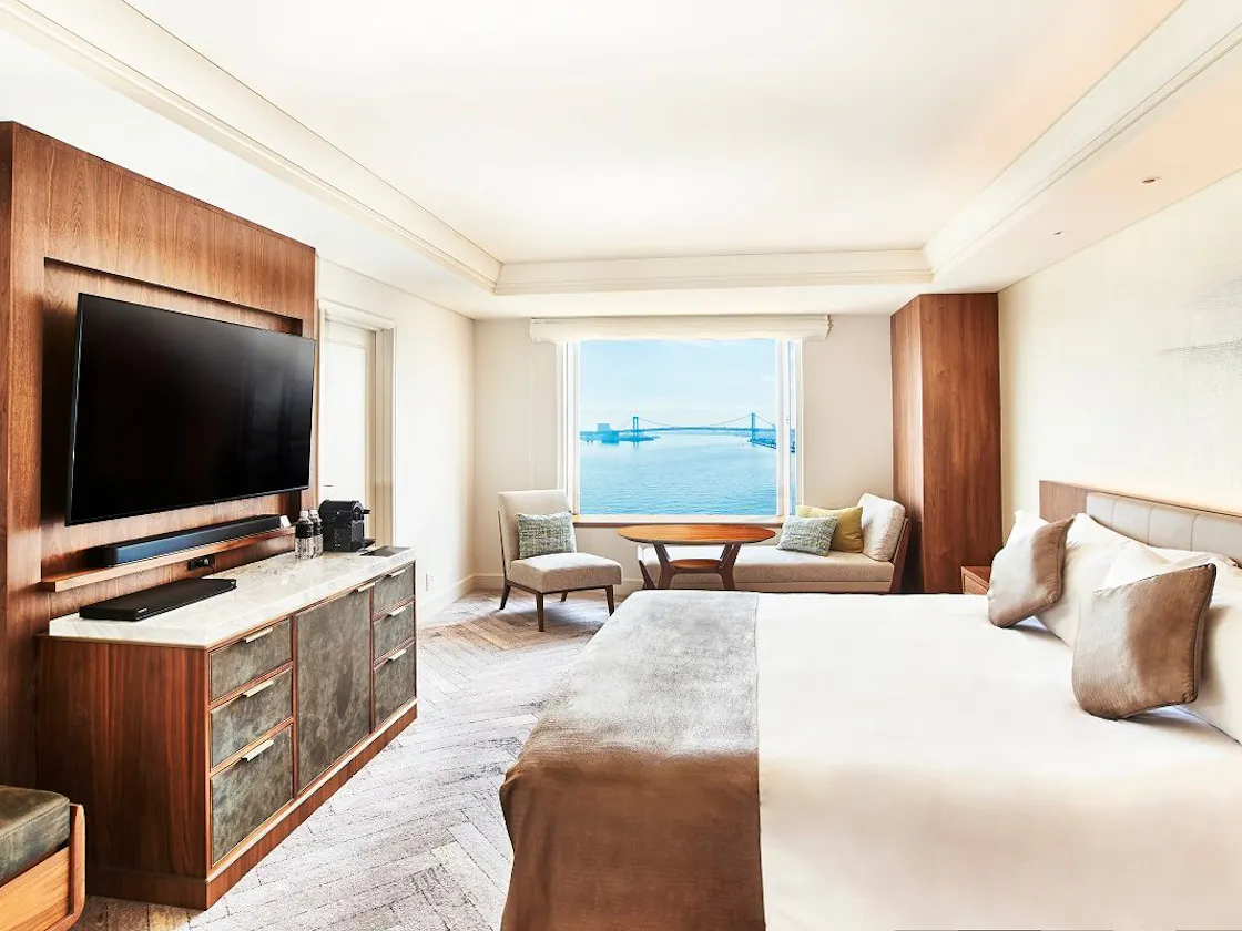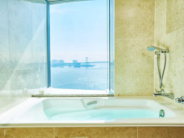 お部屋はもちろん、バスルームに窓があるラグジュアリーな客室です。 レインボーブリッジやお台場を間近に望むベイビューの眺望は、訪れるお客様の目を愉しませ、ご滞在を深く印象付けてきました。 眼下に広がる海は、夕刻から夜に従って色彩が変化し、レインボーブリッジと調和した抒情的な空間を創り出します。 ウォーターフロントの眺望を楽しんでいただけるデイベッド風のソファを設置。 また、ワーキングデスクを兼ねたダイニングテーブルでは、ルームサービスでのお食事や寛ぎのナイトタイムをお過ごしいただけます。 さらにミニバー、ネスプレッソマシン、アメニティ類を収納したサイドボード、手荷物をスマートに収納できるベンチチェストを配し、ゆったりとしたスペースと心地よい時間をご提供いたします。 ご友人やご家族、ビジネスからレジャーまで幅広い目的でご利用いただけます。 ■客室設備のご案内■ ○水辺の景観を楽しむデイベッド風ソファの設置 ○55インチテレビと薄型の高性能スピーカー ○ネスプレッソマシーン ○遮光カーテン ○バスルーム ○パナソニック ビューティー「ナノケア」ヘアドライヤー ○ハーブティー ○オリジナルスリープウェア ○セイフティーボックス ○ミニバー(有料) ※写真は全てイメージです。