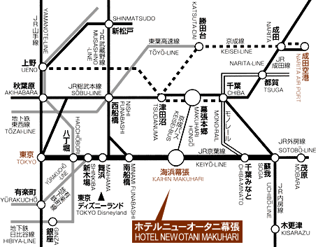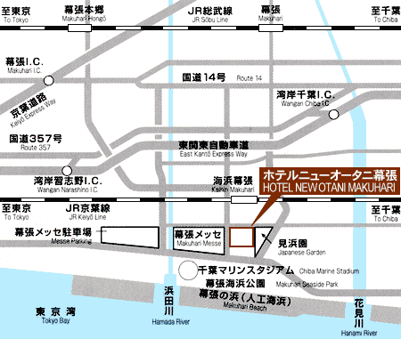 [電車] 東京~海浜幕張:JR京葉線快速で約30分~ホテルニューオータニ幕張:徒歩5分 秋葉原~幕張本郷:JR総武線で40分~幕張メッセ:京成バスで10分