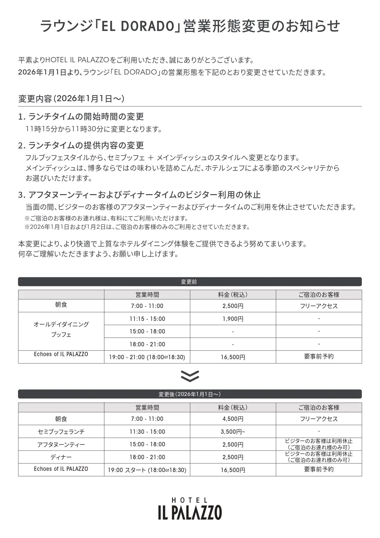 本変更により、より快適で上質なホテルダイニング体験をご提供できるよう努めてまいります。