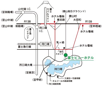 【東名高速道路】御殿場ICにて下車、国道138号線経由で富士五湖道路利用、富士吉田IC下車 (富士吉田ICより約10分)