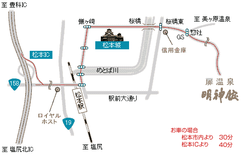 ■タクシー・シャトルバス(事前予約制)で 松本ICから扉温泉まで40分 諏訪ICから扉温泉まで1時間30分 <シャトルバスをご利用のお客様へ> バス乗り場はこちらのURLよりご確認くださいませ。 https://www.tobira-group.com/myojinkan/access/bus.html ■東京方面より ・電車で 新宿・中央東線特急あずさ2時間40分→松本→タクシー・シャトルバス30分→扉温泉 ・お車で 東京・中央高速210km→松本IC→2km→松本市内→県道松本和田線14km→扉温泉 東京・中央高速170km→諏訪IC→ビーナスライン(冬季閉鎖あり)14km→(霧が峰、白樺湖)→扉峠→扉温泉 ■大阪方面より ・電車で 新大阪・新幹線ひかり1時間4分→名古屋→中央西線特急しなの2時間10分→松本→タクシー、シャトルバス30分→扉温泉 ・お車で 大阪・名神高速180km→小牧IC→中央高速195km→松本IC→2km松本市内→県道松本和田線14km→扉温泉 大阪・名神高速180km→小牧IC→中央高速185km→諏訪IC→ビーナスライン(冬季閉鎖あり)14km→(霧が峰、白樺湖)→扉峠→扉温泉 ※お車でお越しのお客様へ (1)ビーナスラインは冬期閉鎖(例年11月中下旬~4月中下旬)となりますので、冬期は松本市街地方面からお越しくださいませ。 (2)ビーナスラインから扉峠を経由してお越しになられる場合は、扉峠からは「よもぎこば林道」( 別名「アザレアライン」)を経由してお越しくださいませ。車載のナビゲーションシステムによっては、狭路急坂の道を案内する場合もあるようです。ご不明な点は明神館までお問い合わせくださいませ。