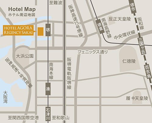 ■電車で(南海本線「堺」駅西口に直結) 南海本線 「なんば」駅より特急 または 急行で約9分 南海本線 「和歌山市」駅より特急で約45分 ■バスで 南海高野線 「堺東」駅より南海シャトルバスで約10分 「堺」駅下車 ■飛行機で 関西国際空港より、特急ラピードで約25分、空港急行で約37分 ■お車で 阪神高速道路湾岸線 大浜出口より約5分 阪神高速道路堺線 住之江出口より約10分