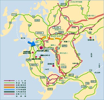 ・長崎―(長崎バイパス経由)―長崎多良見IC―(長崎自動車道)―東そのぎIC―(国道205号線)―ハウステンボス【所要時間1時間5分】