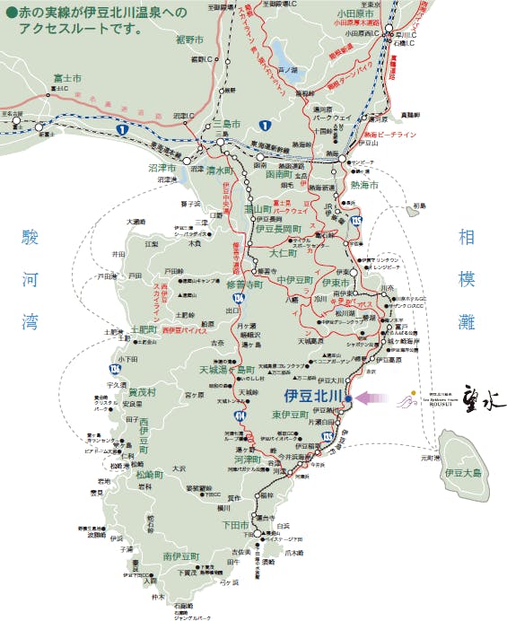 ■新幹線(こだま号)を利用の場合 ・熱海駅まで 東京より 55分 ・名古屋より 1時間40分 ・新大阪より 3時間 ■熱海より普通電車で伊豆熱川駅まで約1時間 ■直通電車(特急踊り子号)を利用の場合 ・東京から伊豆熱川駅まで2時間20分 *ご連絡いただければ、伊豆熱川駅までお出迎えいたします。 ■お車でお越しになる場合 ・東京ー厚木ICー小田原ー熱海ー伊東ー北川約3時間 ・名古屋ー沼津IC-修善寺ー伊東ー伊豆高原ー北川 約4時間30分 ・正面玄関は国道135号線沿いにございます。