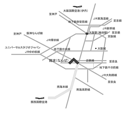 ・地下鉄御堂筋線利用によりなんば駅まで、JR新大阪駅からは15分、大阪駅(梅田駅)からは10分