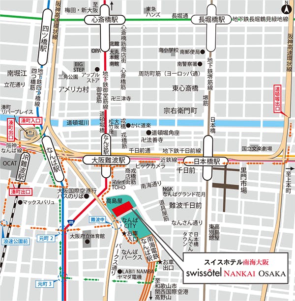 スイスホテル南海大阪は、南海電鉄のなんば駅の真上に位置し、エンターテイメント、カルチャー、ダイニングなど難波の魅力を満喫したいお客様に最適です。地下鉄やバスの駅まで徒歩わずかという便利なロケーションのため、大阪の散策はもちろん、京都、奈良、神戸の周辺エリアへのアクセスも抜群です。ホテルからわずか210m先には毎年恒例の大相撲トーナメントで知られるエディオンアリーナ大阪や、お買いもの三昧を楽しめる心斎橋筋商店街、500m先にはLEDで彩られた道頓堀などがあり、難波の観光スポットを徒歩でお楽しみいただけます。