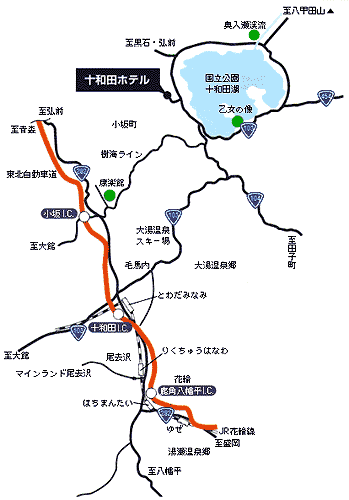 【東北自動車道】 ●十和田I.Cより約50分 ●小坂I.Cより約40分 ●黒石I.Cより約60分(冬期は通行止め区間あり) 【東北新幹線】 ●八戸駅より お車で約120分(国道102号経由) 路線バス→約135分+ホテル送迎→約15分 ●盛岡駅より お車で約120分(高速利用) 【空港】 ●青森空港より 黒石経由 お車で約100分 八甲田経由 お車で約130分 (どちらも冬期は通行止め区間あり) 路線バスで約240分 (青森空港~青森駅乗り換え~終点よりホテル送迎) ●三沢空港より お車で約120分 ●大館能代空港より お車で約100分
