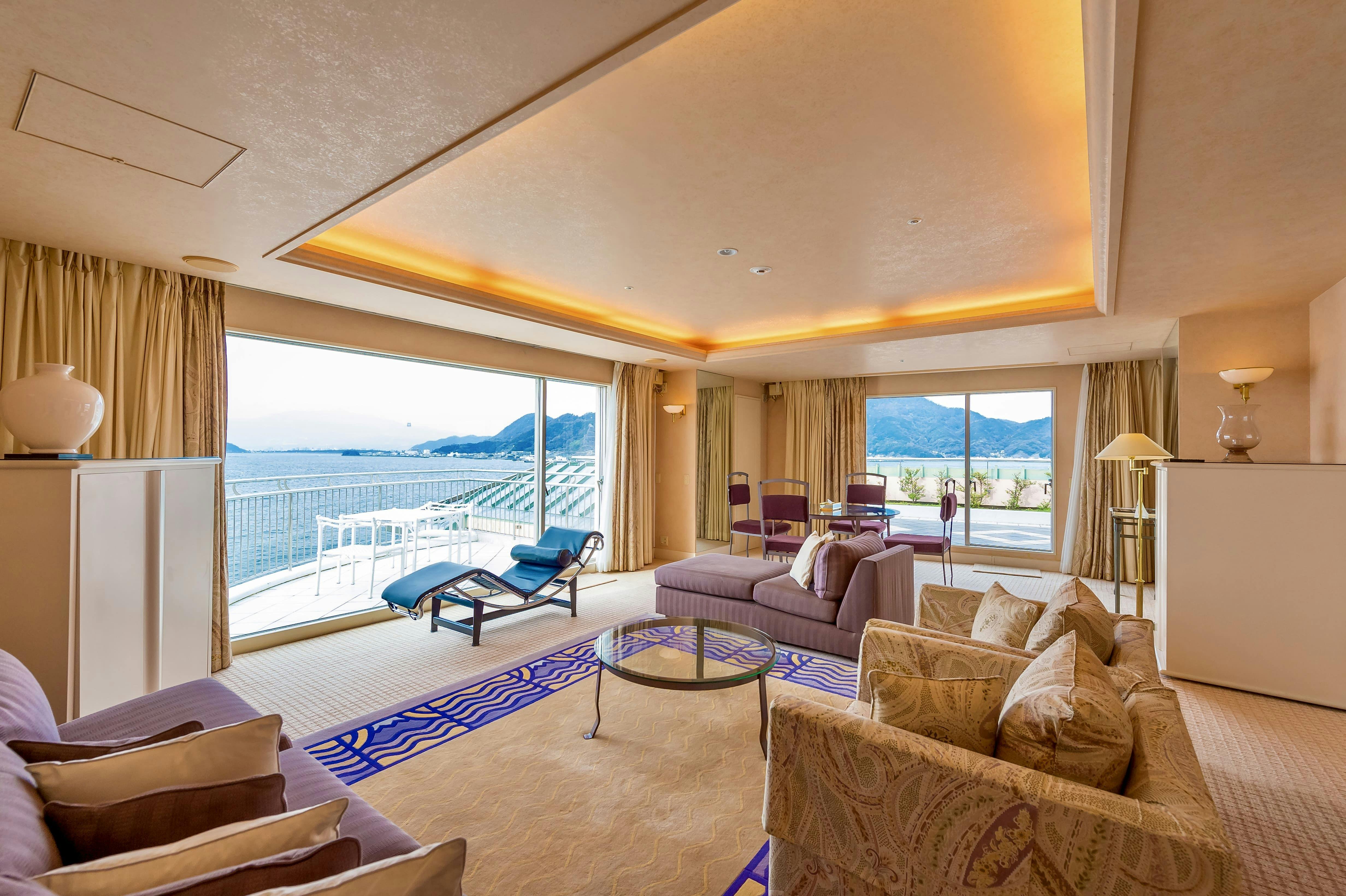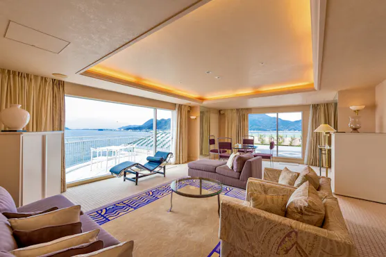 世界文化遺産の富士山の全景を望み、富士山に向け飛び立とうとする鳥のように、全室から日本一の霊峰を望めるように設計されたホテル。駿河湾の小さな無人島に、日常を離れ、心身共にゆったりとしたやすらぎの時間を提供する、大人のためのプライベートリゾートホテルとして、数多くのお客様にご利用いただいています。 お部屋はすべて、リビングと寝室をそなえたスイートルーム、全室オーシャンフロントで、バルコニーからの景色は絶景です。南仏を思わせるコーディネートと、調度品が美しいお部屋で、波音と海風が心地よい、寛ぎのひとときをお過ごしください。 また、館内2階には、ご宿泊のお客様が自由にご利用いただけるラウンジをご用意しております。 赤ワイン・白ワインなどのアルコール類に加え、コーヒー、紅茶、ハーブティー、ソフトドリンクも取り揃えており、営業時間内であればいつでもご利用いただけます。 絶景とともに、ゆったりとした優雅なひとときをお楽しみください。