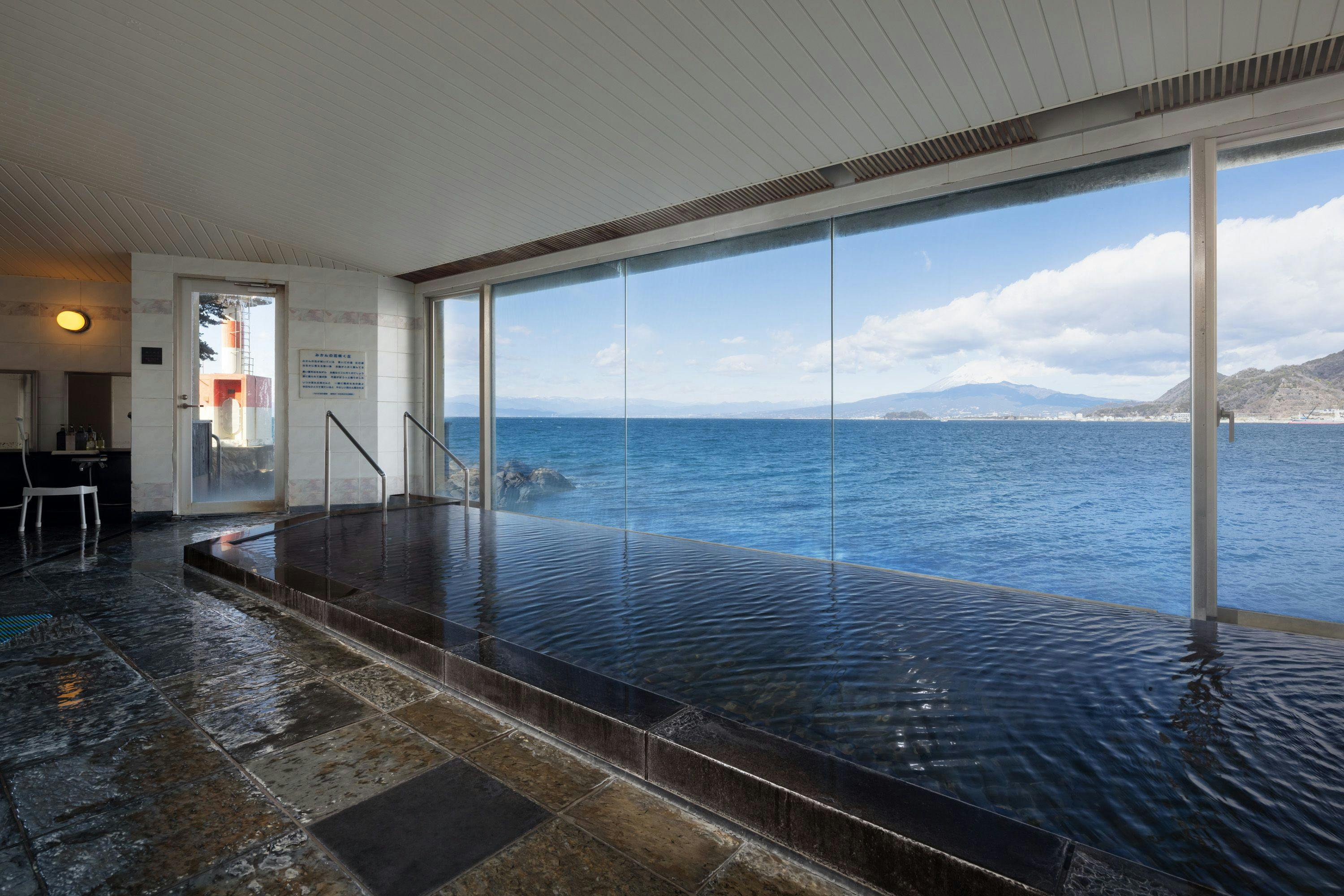 淡島唯一の絶景大浴場。 駿河湾越しに望む富士山を眺めながらのんびりと大浴場を満喫していただけます。