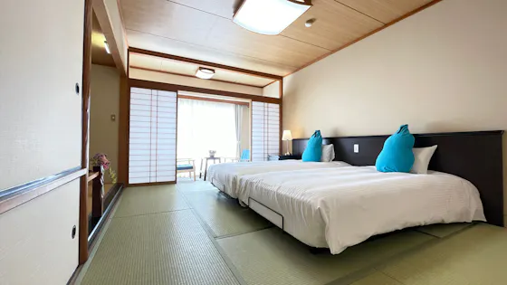 露天風呂・足湯付きツインルームでは、琉球畳と低床ベッドで最上のくつろぎをお約束いたします。都会の喧噪を忘れた上質な一時を心ゆくまで。
