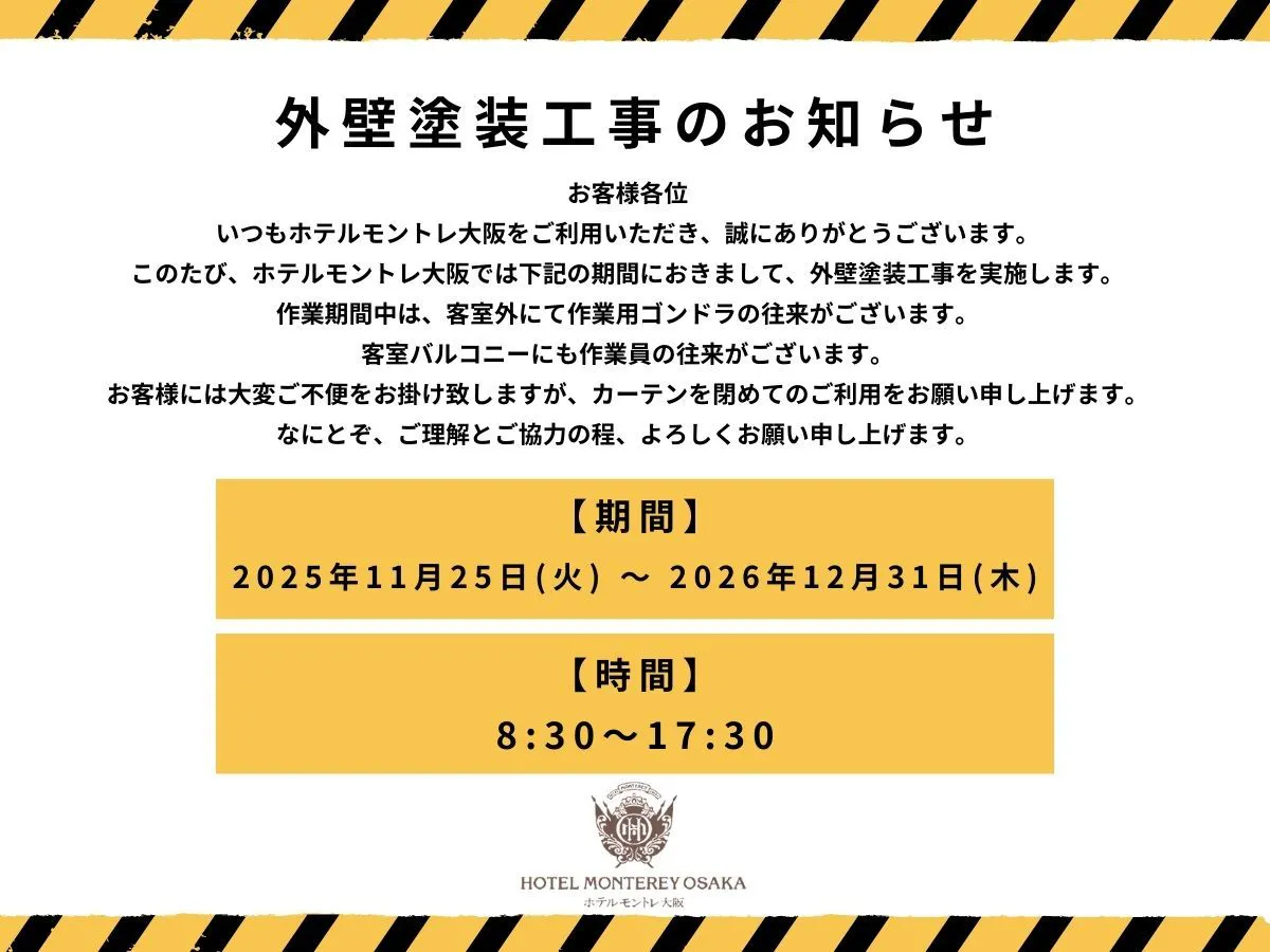 ホテルモントレ大阪では下記の期間におきまして外壁塗装工事を実施致します。