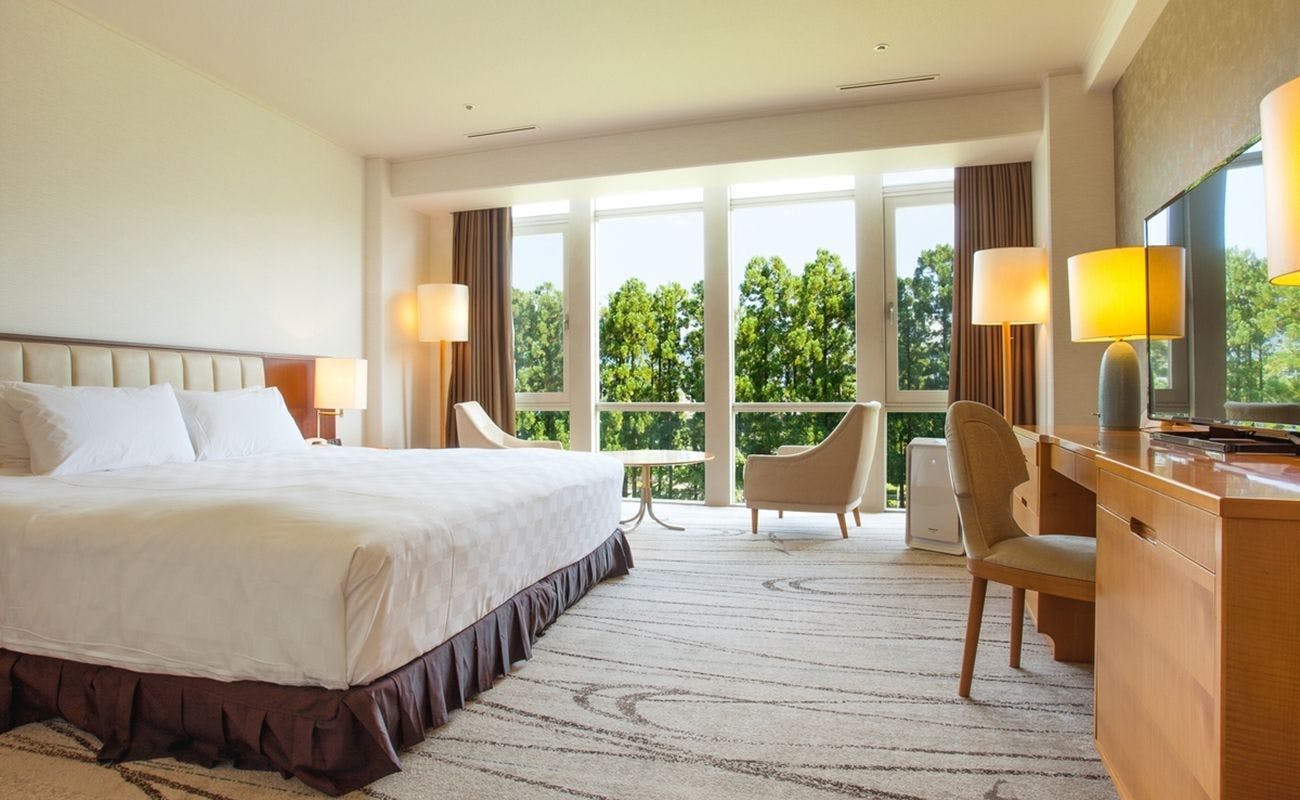 中庭をかこんだ片廊下に配された全310室の客室はプライバシーと防音性を尊重した設計。1室あたり約37平米の広いお部屋。窓ぎわには広々としたリビングスペースを配置するなど、快適さへのきめ細かい配慮がなされています。窓外には豊かな自然を臨むことができ、静かなくつろぎのひとときをお過ごしいただけます。