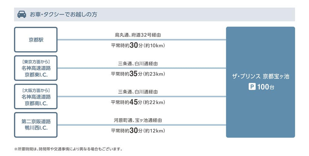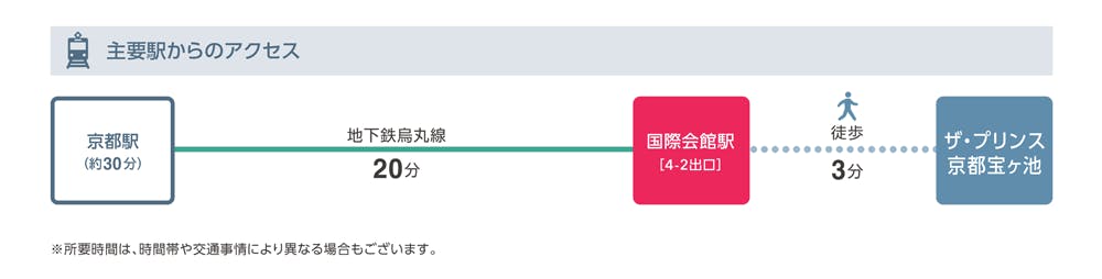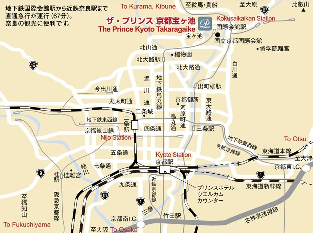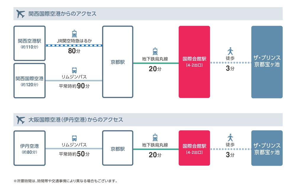 ■電車 京都市営地下鉄で京都駅から国際会館駅まで20分。国際会館駅から徒歩7分(4-2出口より徒歩3分)。 ■車 京都駅からタクシーで30分(約3,500円) 大阪国際空港からタクシーで平常時1時間30分。 名神高速道路京都南I.C.から平常時45分、京都東I.C.から平常時35分 (ザ・プリンス 京都宝ヶ池は国立京都国際会館に隣接しておりますので、お車でのお客さまは国立京都国際会館の道路標識に従ってお越しください)