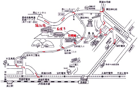 長崎自動車道多良見インターより長崎バイパスで県庁・西山方面出口を出て、3つ目の信号(西片橋交差点)を右折。※ながさき出島道路経由は遠回りになります。