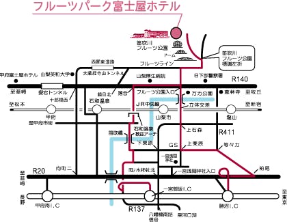 ■お車ご利用 中央自動車道「勝沼I.C」から13km 30分 中央自動車道「一宮御坂I.C」から11km 25分 ■電車をご利用 JR中央線山梨駅下車、タクシー利用 5km 7分 石和温泉駅下車、タクシー利用 9km 20分 塩山駅下車、タクシー利用 11km 25分