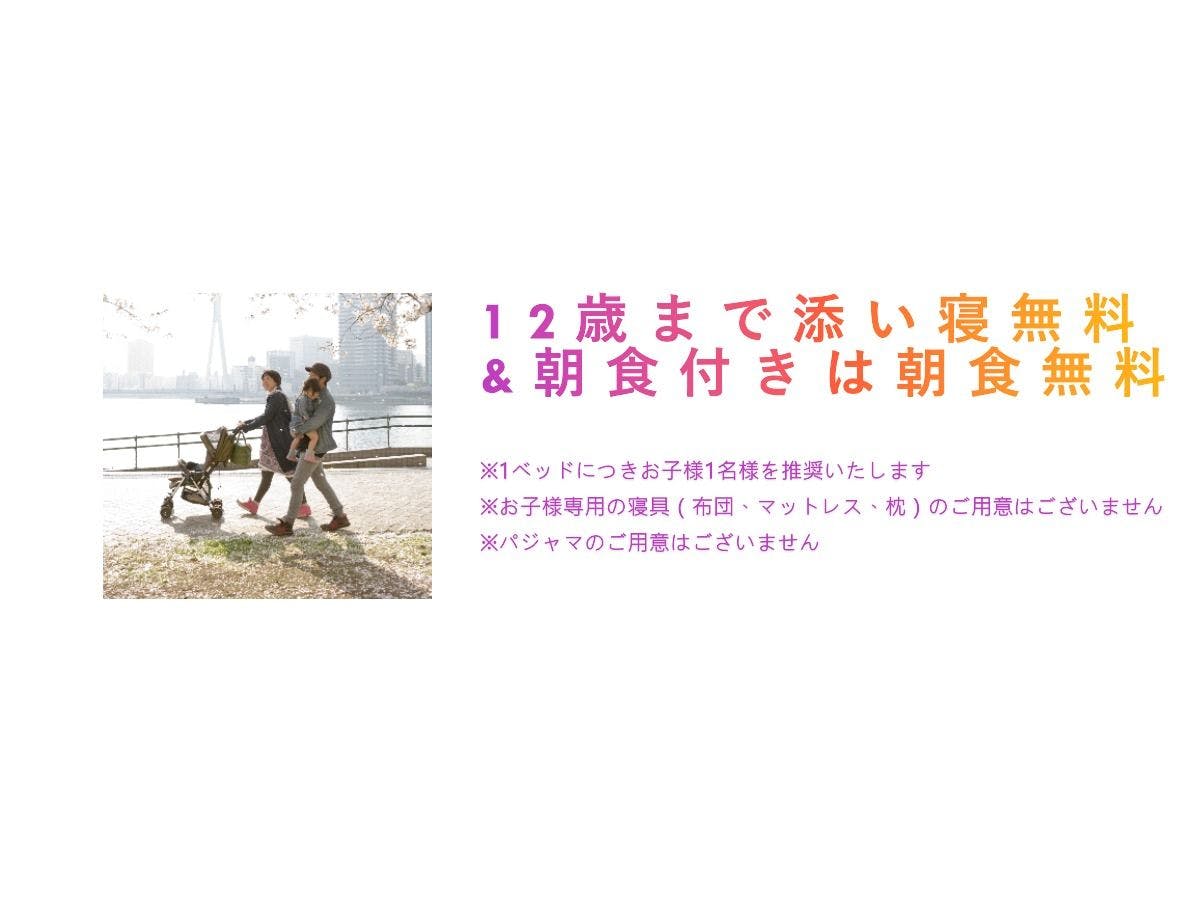 お子様の添寝(ご朝食付きを選択頂いた場合は朝食代も含む)はサービスとさせて頂きます。但し、お子様専用の寝具(布団、マットレス、枕)及びパジャマのご用意はございませんので、予めご了承くださいませ。 お子様専用の寝具が必要な場合は有料となりますので、別途ホテルまでお問い合わせくださいませ。 ※予約サイトではベッド数を超えてのお子様の人数のご入力も可能となりますが、原則、1ベッドにつき1名様までのお子様の添寝を推奨しております。最大許容人数を超えてのお子様の添寝でのご予約の場合、本件につきまして了解を得た上でのご予約と見なします。