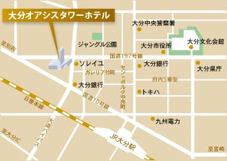 大分空港→特急バスエアライナー乗車→大分駅まで約60分 JR大分駅から徒歩約10分 九州横断自動車道大分ICから車で約15分 観光スポット「うみたまご」まで車で約15分 別府市内まで車で約25分 湯布院まで車で約1時間