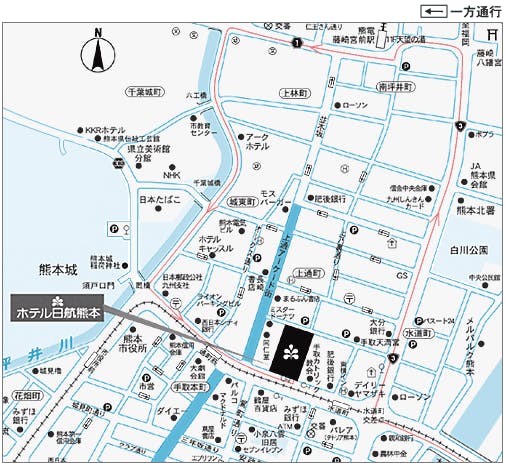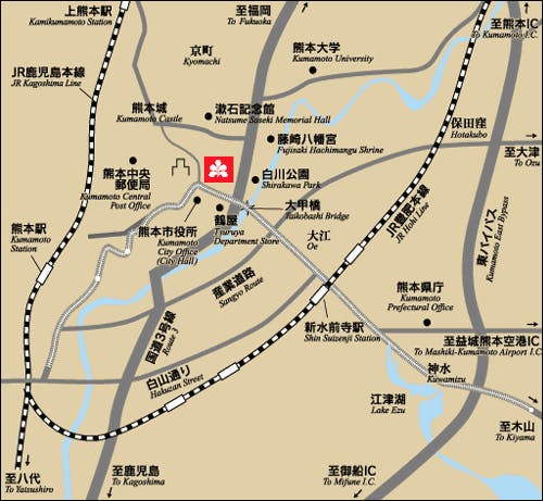 上通アーケード入口 鶴屋百貨店向い側 熊本空港からリムジンバスで「通町筋」下車(40分) JR熊本駅から市電・健軍方面「通町筋」筋下車(20分)