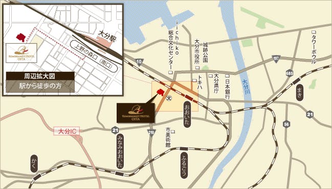 ・JR大分駅上野の森口より 徒歩 8分 ・JR大分駅上野の森口より タクシー利用 5分 ・大分空港より リムジンバス利用 60分 (JR大分駅まで) ・大分ICより 車利用 7分