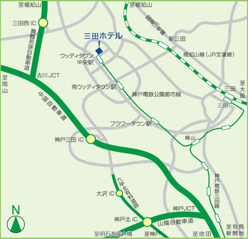 ■電車をご利用の場合 神戸電鉄「ウッディタウン中央駅」から徒歩1分 JR「新三田駅」からタクシーで約5分、神姫バス(44番)で約10分 ■お車をご利用の場合 中国自動車道・六甲北有料道路・神戸三田インターから約5分 舞鶴自動車道三田西インターから約5分