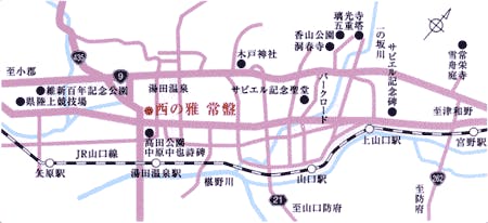 ■電車をご利用の場合 ・山口線利用:湯田温泉駅で下車 徒歩10分 ・新幹線利用:新山口駅で下車 →新山口よりタクシーで約20分 →新山口よりバスで約30分(湯田温泉下車) ■飛行機をご利用の場合 ・宇部空港よりタクシーで約40分 ■お車でお越しの場合 ・中国自動車道又は山陽自動車道 (小郡I.C、山口I.C)より各15分