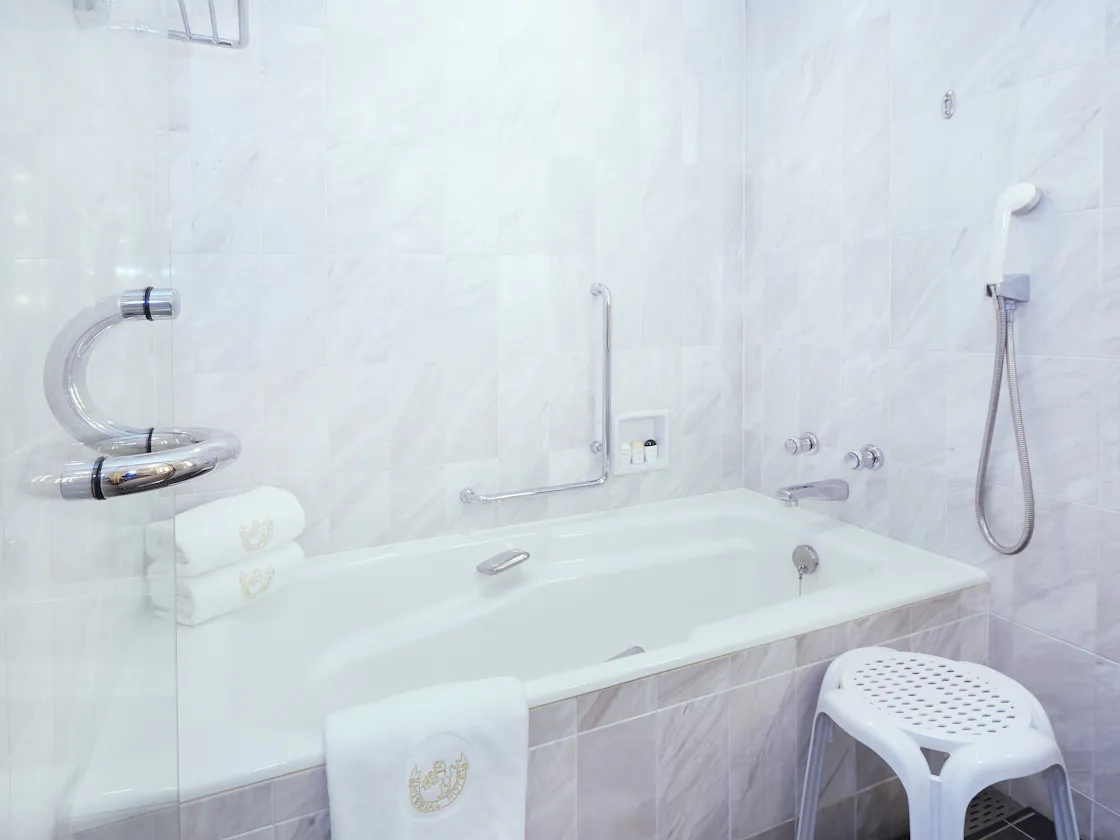 40平米ゆとりある空間は、ご家族、ご友人とのご滞在にくつろぎのひと時を演出します。 【洗い場付きバスルーム】・・・ ご自宅のようにゆったりと。高齢のお客様やお子様にも安心してご利用いただけます。シャワーチェアもご用意。 ■デュベ(羽毛掛け布団) ■Wi-Fiネットワーク(無料) ■ライティングデスク 〇バスタオル、ハンドタオル、フェイスタオル 〇シャワーキャップ 〇ハミガキセット 〇シャンプー、コンディショナー、ボディソープ 〇石鹸、髭剃りセット 〇綿棒、ブラシ 〇スリッパ、浴衣 〇ミネラルウォーター1本(1リットル)/日 〇紅茶・お茶セット 〇カプセルコーヒーメーカー 〇朝刊1紙