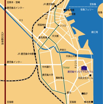 【JR鹿児島中央駅より】 ・バス 15分 ・タクシー 10分 【お車】 九州縦貫自動車道鹿児島インターより 鹿児島市内方面へ直進約15分 【バス】 ●鹿児島空港より空港連絡バス「鹿児島市内行き」約40分、「鹿児島中央駅」か「天文館」下車。無料シャトルバス約20分前後。