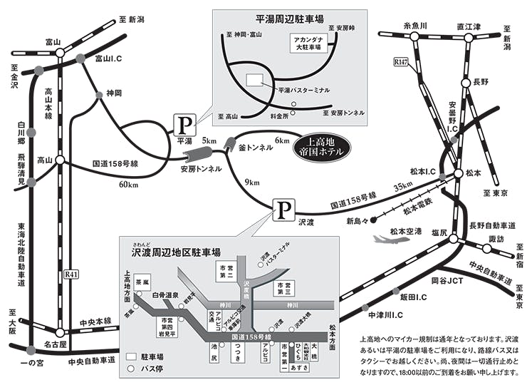 上高地へのマイカー規制は通年となっております。沢渡あるいは平湯の駐車場をご利用になり、路線バス又はタクシーでお越しください。尚、夜間は一切通行止めとなりますので18:00迄のご到着をお願い申し上げます。又、雨量規制等により通行止めとなる場合がございます。天候不順の場合は現地上高地帝国ホテルに天候及び道路状況のお問合せをお願いいたします。