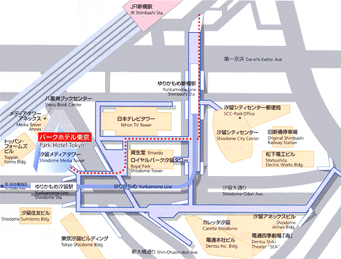 <電車の場合> 都営地下鉄大江戸線「汐留駅」直結(7、8番出口) 新交通ゆりかもめ「汐留駅」改札口を出て左へ徒歩1分 JR、東京メトロ・都営地下鉄「新橋駅」より徒歩約7分 <お車の場合> 東京駅より約8分 羽田空港より約20分 成田空港より約60分 (首都高速都心環状線「汐留IC」より約2分) <エアポートリムジンバスの場合> ※羽田空港便は運休中です ●空港からリムジンバスを利用する場合は銀座・汐留方面をご利用ください。 ※ホテル1階の正面玄関に発着致します。 [成田空港→ホテル] 所要時間は約80~90分 [ホテル→成田空港] 〃 [羽田空港→ホテル] 所要時間は約25~80分 [ホテル→羽田空港] 〃