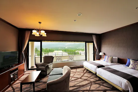全室バルコニーが完備されており、窓の外には箱根外輪山を背景とする広大なゴルフコースが広がる景色を見ていただきます。ゆったりとくつろげる空間で、心豊かな時間を過ごしてみてはいかがでしょうか。