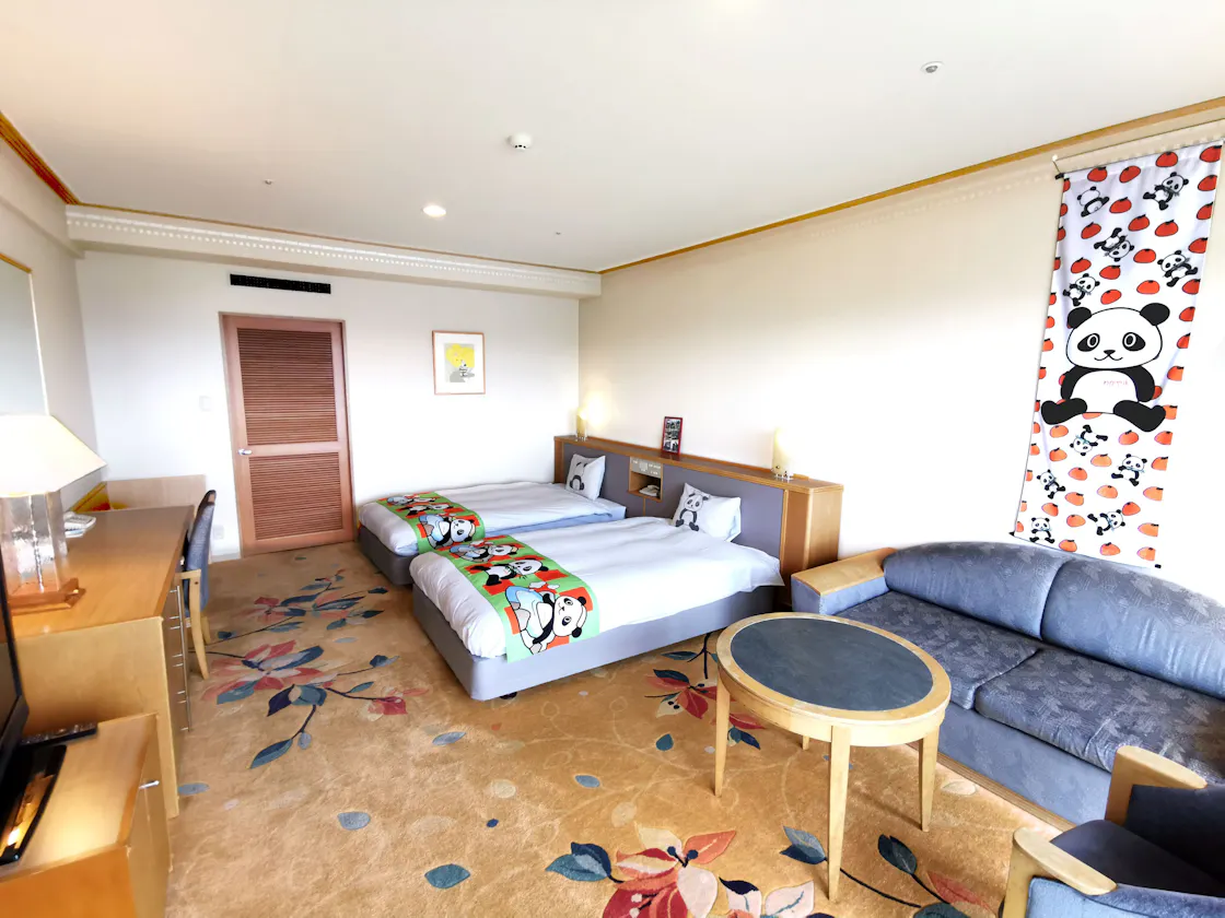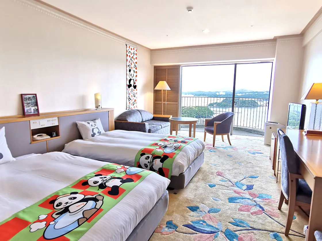 【3室しかない特別なお部屋】 白黒模様のかわいい「パンダ」たちにご宿泊のお部屋でたっぷり出会える【パンダルーム】が出来ました 客室には、パンダスリッパにペアのマグカップ、バスルームにはパンダ柄のバスマット、洗面台にはパンダ柄のタオルやコップ、アメニティ袋をご用意。パンダファンには、たまらない魅力的なお部屋です! ※全室オーシャンビュー (お部屋の大きな窓からは美しい海を一望できます) お部屋は7階にございます。 広さ:45平米 バス・トイレ(ウォシュレット)付き 加湿空気清浄機も完備 ベッドサイズ 120cm×203cm ※こちらのお部屋は【禁煙ルーム】になります。 ※3名1室利用時の内1名様はソファベッドになります。