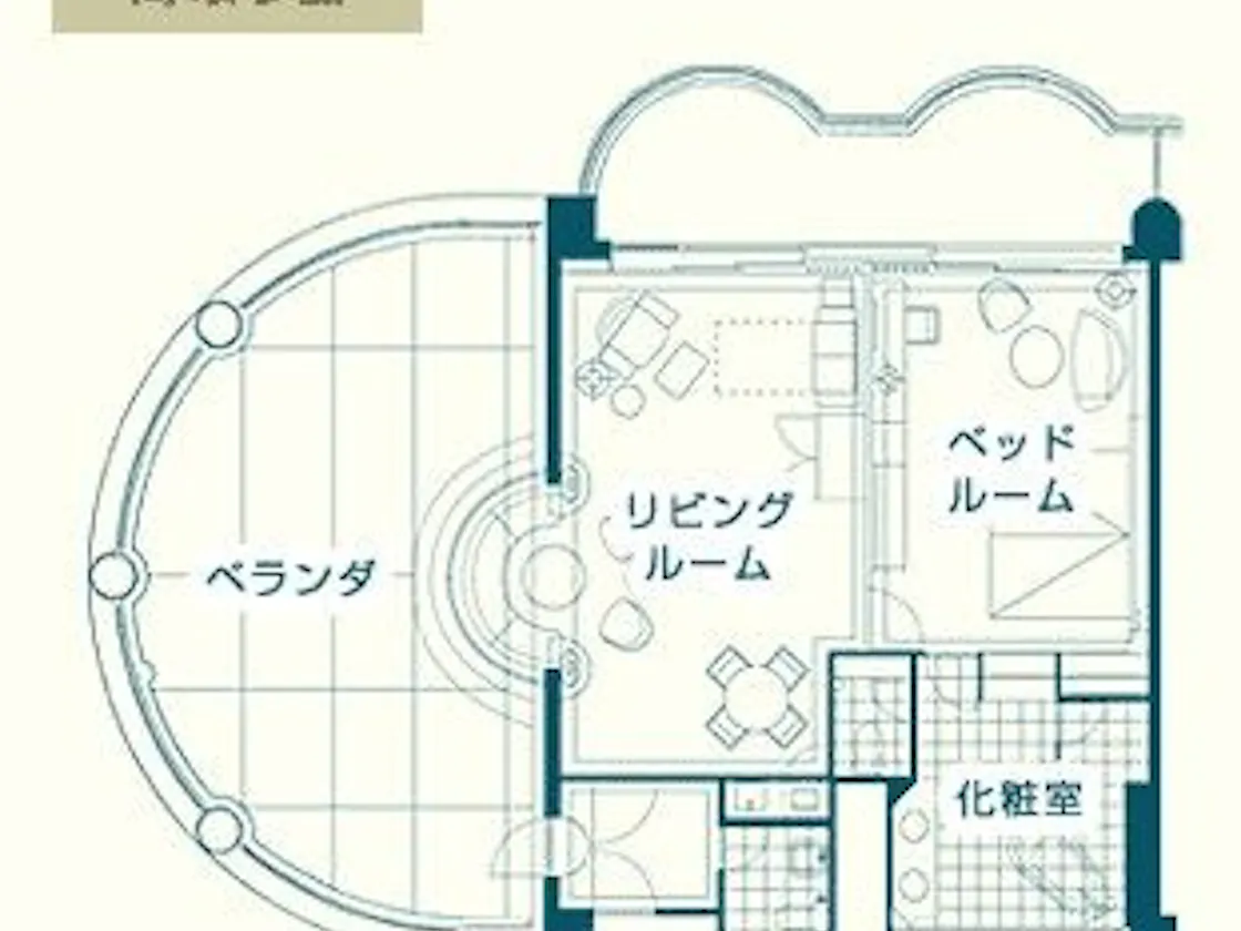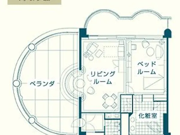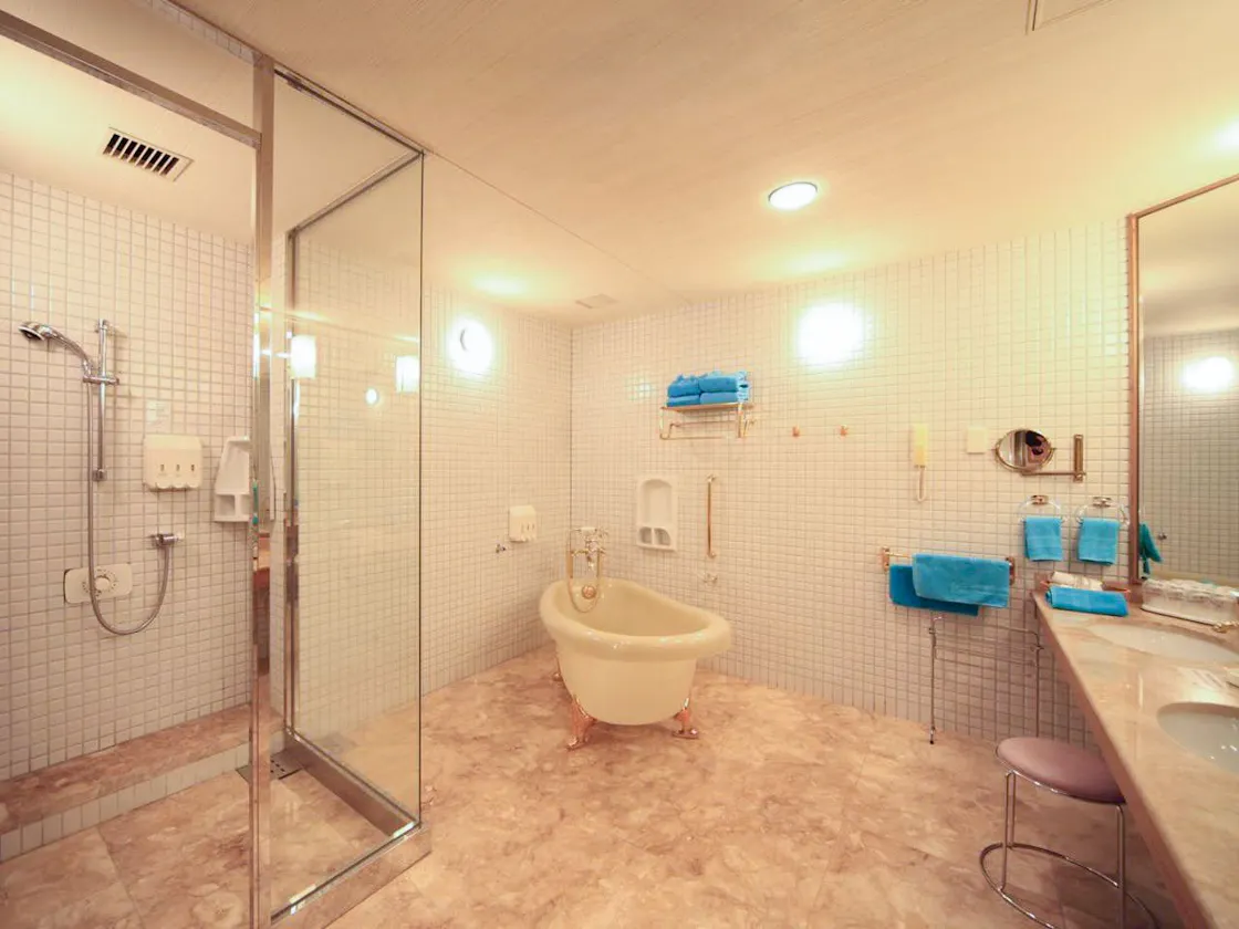 かわいいピンクのロイヤルスイートは94平米。 玄関を入ると第一化粧室、円形に広がるベランダは約40平米、リビングルームにつながるドアを入るとベランダと一体化した円形のソファに自動カーテン、フランスの画家ボン・ゴヴァンのポピーの花の絵が飾ってあります。隣の寝室にはシモンズ社製のベッドを使用。 第二化粧室は、シャワールーム、お手洗いは独立していて、ヨーロッパのお城にありそうなかわいい金の猫足に陶器のお風呂。
