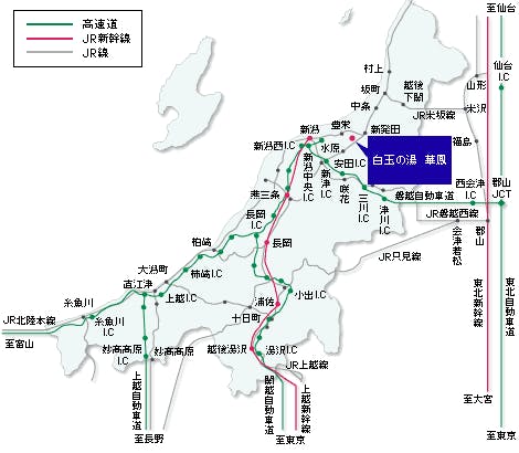 ■電車でお越しの場合 [上越新幹線] 東京駅 → 新潟駅 (1時間40分) [東北新幹線] 仙台駅 → 大宮駅 → 新潟駅 (3時間15分) [JR北陸本線] 金沢駅 → 新潟駅 (4時間) 新潟駅から路線バス → 60分 1,500円 新発田駅から路線バス → 20分 500円 詳しくは公式ホームページをご覧ください ■お車でお越しの場合 [関越自動車道] 東京・練馬I.C → 新潟西I.C (3時間40分) [北陸自動車道] 金沢東I.C → 新潟西I.C (4時間) ※新潟西I.Cより新新バイパスで競馬場I.Cを降りて豊栄方面へ。月岡温泉まで40分。 [磐越道] 郡山I.C → 安田I.C (2時間) ※安田ICより国道290号線を新発田方面へ向かって15分で月岡温泉へ。
