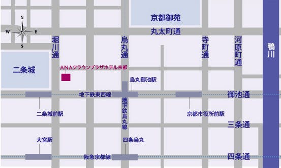 ・地下鉄東西線「二条城前駅」2番出口より徒歩1分 ・地下鉄烏丸線「烏丸御池駅」から徒歩12分 ・阪急「大宮駅」から徒歩15分 ・JR「京都駅」、京阪「三条駅」から車で15分 ・大阪伊丹空港から車で60分 ・関西空港からJR特急“はるか”で75分 ■無料シャトルバスのご案内 ・ホテル→JR京都駅八条口 7:20 8:00 9:20 10:40 12:00 13:20 14:40 16:00 17:20 18:40発 ・JR京都駅八条口→ホテル 7:40 8:40 10:00 11:20 12:40 14:00 15:20 16:40 18:00 19:20発