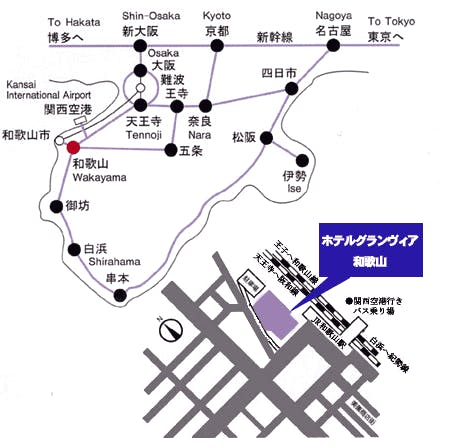 JR和歌山駅下車徒歩2分 ■京都から…特急スーパーくろしおで90分 ■新大阪から…特急スーパーくろしおで60分 ■大阪から…紀州路快速で80分 ■天王寺から…特急くろしおで45分 ■関西国際空港から…リムジンバスで40分(JR和歌山駅下車)