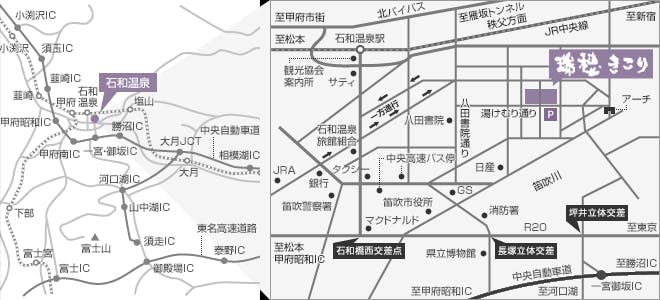 お車でお越しの場合 ■東京より 東京・高井戸I.Cより、中央自動車道を一宮・御坂I.Cへ(1.5時間) 一宮・御坂I.Cより、国道20号線を通り、石和温泉へ(5分) ■名古屋より 名古屋より、東名自動車道を富士I.Cへ(2.3時間) 富士I.Cより、国道139号線を河口湖へ(40分) 河口湖より、国道137号線を石和温泉へ(30分) 名古屋・小牧JCTより、中央自動車道を一宮・御坂I.Cへ(3.2時間) 一宮・御坂I.Cより、国道20号線を通り、石和温泉へ(5分) ■長野より 長野I.Cより、長野自動車道を岡谷JCTへ(1時間) 岡谷JCTより、中央自動車道を一宮・御坂I.Cへ(1時間) 一宮・御坂I.Cより、国道20号線を通り、石和温泉へ(5分) 電車でお越しの場合 ■東京より 新宿駅よりJR中央線特急で石和温泉駅へ (1.3時間) ■名古屋より 名古屋よりJR中央線特急で松本駅へ(2時間) 松本駅よりJR中央線特急で石和温泉駅へ(1.3時間) ■長野より 長野より篠ノ井線で松本駅へ(1時間) 松本駅よりJR中央線特急で石和温泉駅へ(1.3時間)