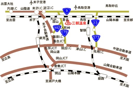 ■お車で 大阪吹田IC~院庄IC~三朝温泉(約3時間10分) 広島IC~岡山IC~湯原IC~三朝温泉 (約3時間20分) ■電車で 大阪~倉吉(約3時間) 広島~姫路~倉吉(約3時間20分) 広島~岡山~鳥取~倉吉(約3時間40分) ■バスで 大阪市内~倉吉(約3時間40分) 広島バスセンター~倉吉(約3時間55分) ※倉吉駅から当館専用の送迎バスをご用意いたします。(予約制) ■飛行機で 東京~鳥取空港(1時間10分、1日5便) ※空港~三朝温泉(約1時間)