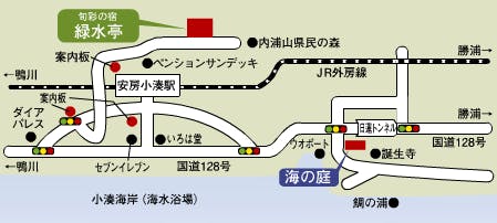 お車でお越しの場合 ■ 久里浜 →(東京湾フェリー)→ 浜金谷 →(県道/長狭街道)→ 鴨川 → (国道128号) → 緑水亭 (1時間40分) ■ 東京 → 館山自動車道 → 君津I.C →(県道92号線・旧 房総スカイライン/旧 鴨川有料道路) → 鴨川 → (国道128号) → 緑水亭 (2時間10分) 電車でお越しの場合 ■東京駅 → (京葉地下ホーム/外房線特急わかしお)→ JR外房線・安房小湊駅 → 緑水亭 (1時間35分)