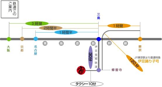 ■お車 東名高速沼津IC→伊豆縦貫道→伊豆中央道→修善寺道路約35分→修善寺温泉 ■東海道新幹線 三島→伊豆箱根鉄道修善寺駅約30分 ■特急踊り子号 JR東京駅→修善寺駅約120分 ※修善寺駅より タクシーで約10分 バスで約10分 (修善寺温泉バス停より徒歩8分)