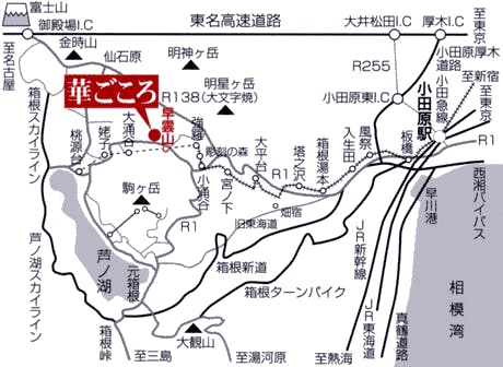 ■電車ご利用の場合 1.JR小田原駅下車 2.小田原駅か箱根湯本駅より登山電車で強羅駅まで 強羅駅より送迎いたします。または小田原駅か箱根湯本駅より湖尻行路線バスにお乗りいただき、早雲山駅で下車、徒歩3分。 ■お車でお越しの場合 1.国道1号線で箱根・強羅を目指します。 2.小涌園ユネッサン付近で国道1号線より湖尻・大涌谷方面の標識の出ている道に入ります。早雲山駅を目標にお越し下さい。