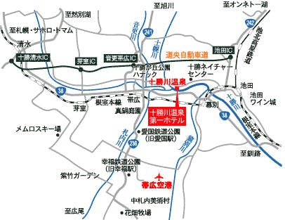 ■お車でお越しの場合 帯広中心部から 20分 釧路から 2時間 旭川から 3時間 札幌から 3時間 (札幌⇔[札幌北IC~音更帯広IC]⇔十勝川温泉) ■空路をご利用の場合(帯広空港から車で40分) 羽田空港→とかち帯広空港 1時間35分 中部小牧→とかち帯広空港 1時間40分 関西国際空港→とかち帯広空港 2時間