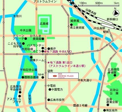 ・路面電車乗り場<広島駅ビル構内 2階>Dホームより「1号線 紙屋町経由 広島港行」で約15分、袋町電停下車 徒歩1分