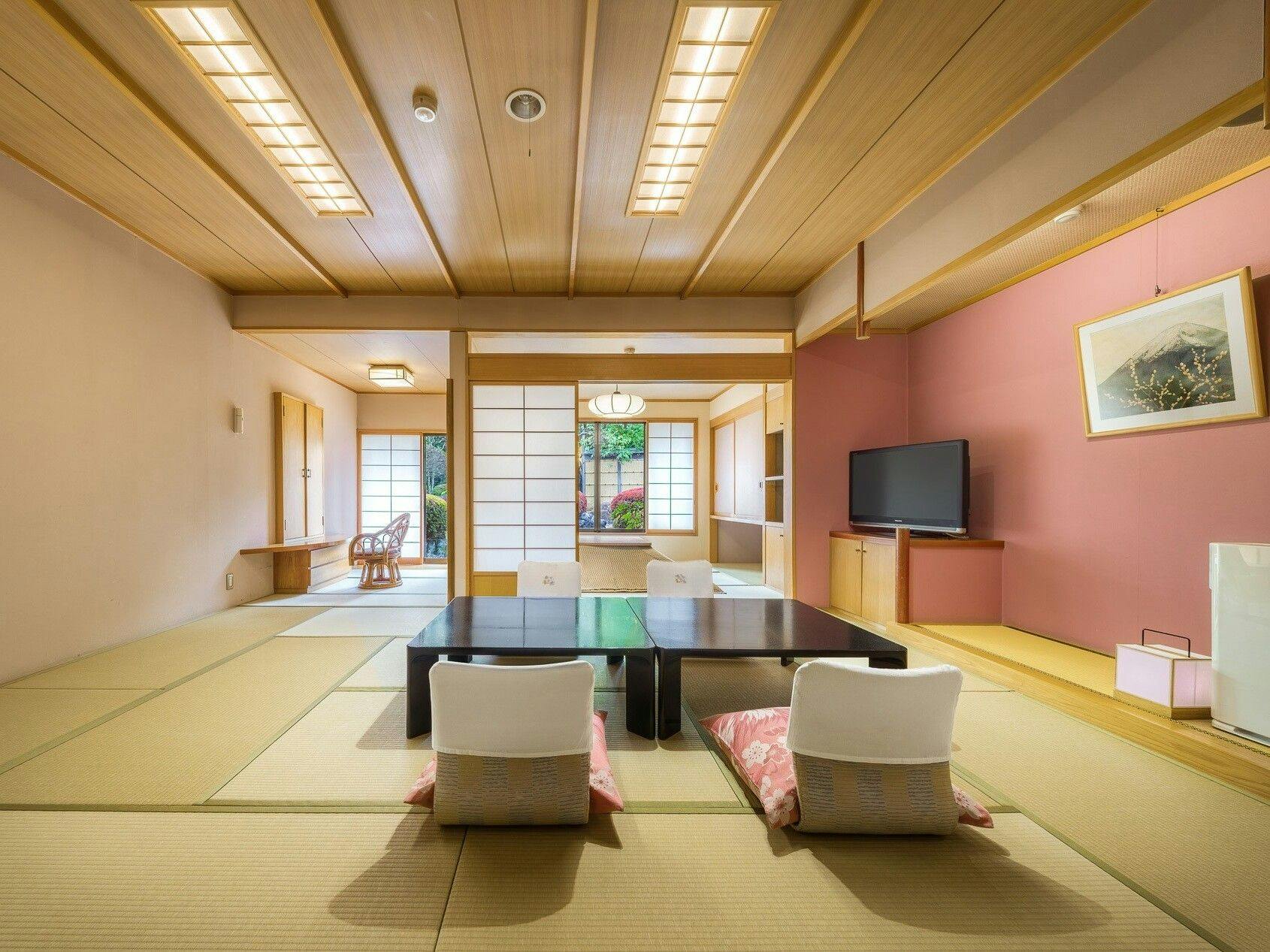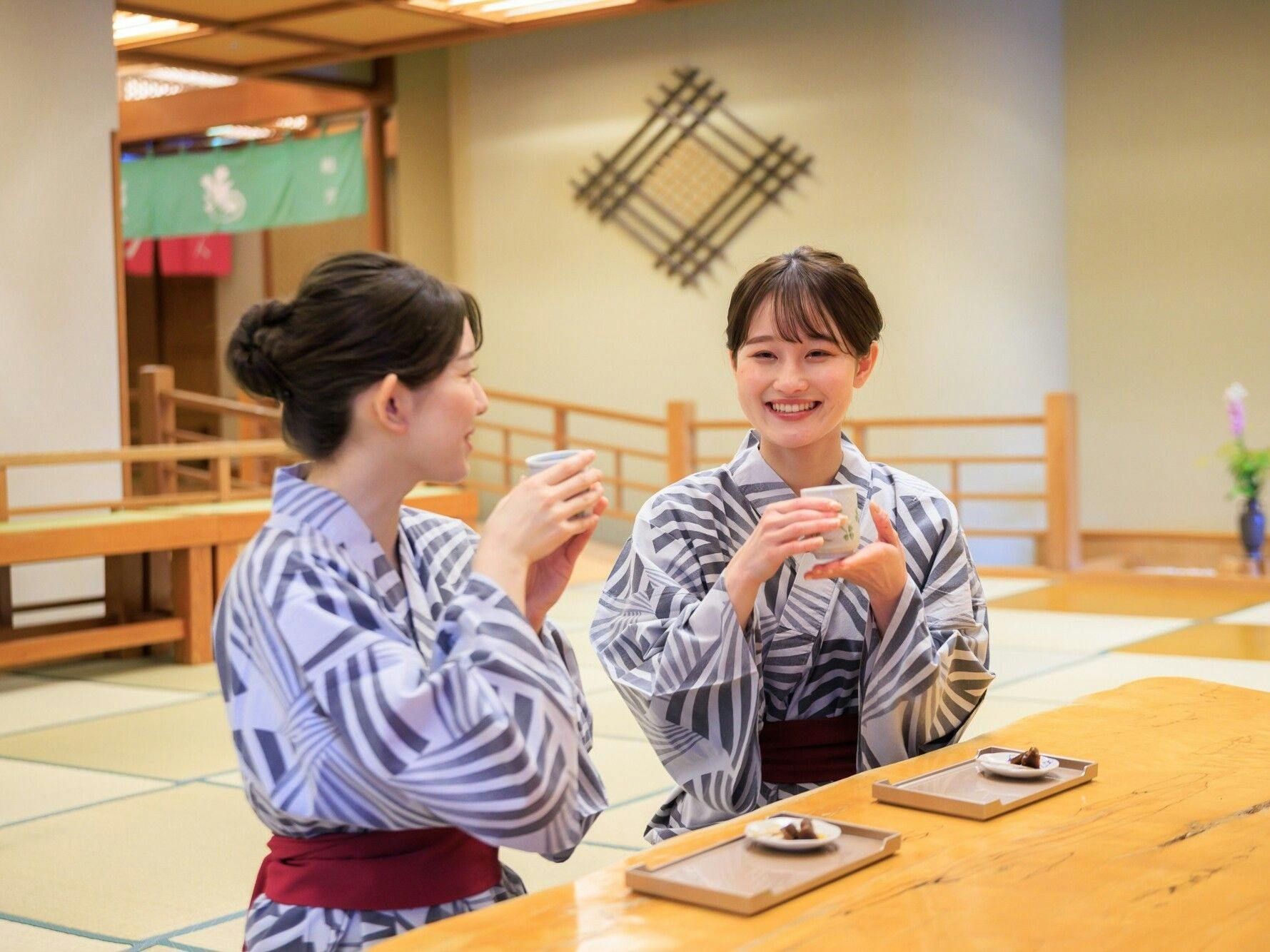 フロントで着物スタッフさんが並んで出迎えてくれるのは圧巻で素敵です。嬉しい恥ずかしいでも嬉しい記憶に残ります。お茶室のお抹茶も夜の和太鼓もビンゴもどれもとても楽しい思い出になりました。どのスタッフさんもとても素敵でした。富士山といっしょにお風呂に入ってるようなこんなベストポジションなお宿は他にないと思います。 お正月に行った時も楽しかったですが今回もまたさらに楽しかったです。