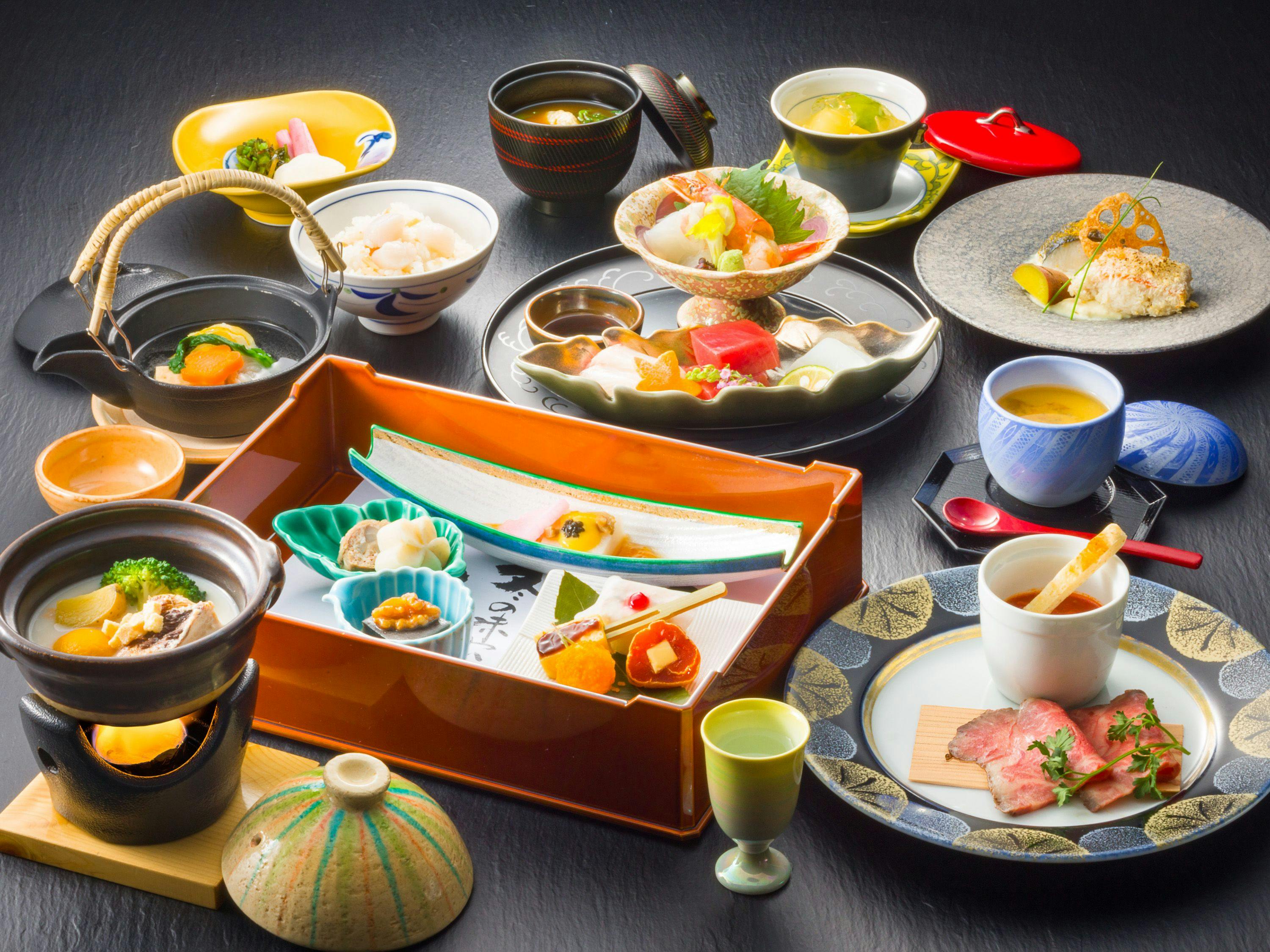 富士山麓の持ち味を生かした美味しく美しい一期一会のお料理をご賞味下さい。 山海の旬の素材にもこだわった笑顔も溢れる美食をおもてなしの心でお提供いたします。 ※写真はイメージとなります、お食事場所・お献立・食器等は宿泊プランや季節により替わります。