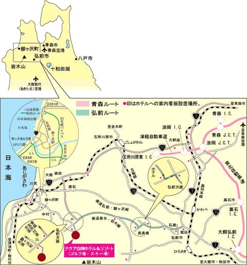 ※ホテル手配での有料送迎は行っておりません。 詳しくはホームページをご覧ください。 電車でお越しの際はタクシーのご利用をお願い致します。 ご迷惑をおかけしますが、ご理解のほどどうぞよろしくお願い致します。 ■電車でお越しの場合 奥羽本線弘前駅からタクシーで40分(約9,500円) 五能線鯵ヶ沢駅からタクシーで20分(約7,000円) ■お車でお越しの場合 東北自動車道大鰐弘前I.C.から国道7号線経由で37km(平常時1時間)。青森市内から国道7号線・101号線経由で60km(平常時1時間20分)