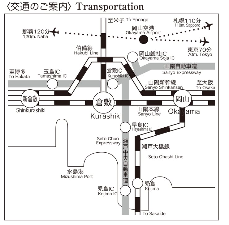 ■お車で 山陽自動車道倉敷ICより約15分。 瀬戸中央自動車道早島ICより約15分。 ■JR・新幹線で 岡山駅より山陽本線・各駅停車で18分、倉敷駅下車。 JR倉敷駅より徒歩約10分。JR倉敷駅南口よりタクシーで3~4分。 ■飛行機で 岡山空港より空港バスで約35分、JR倉敷駅下車。