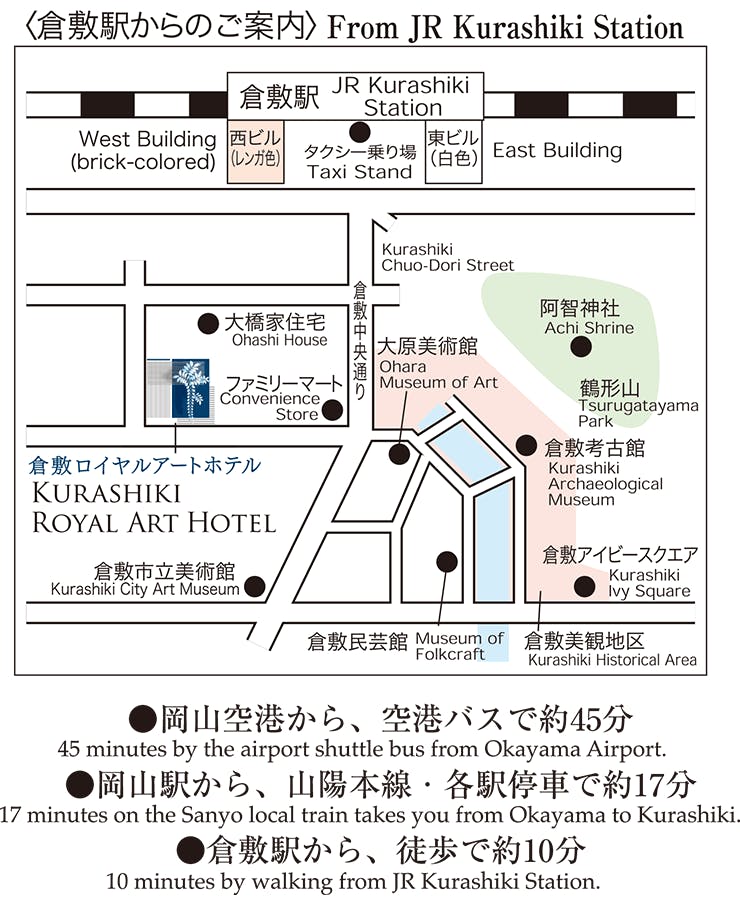 岡山空港より空港バスで約35分、JR倉敷駅下車。