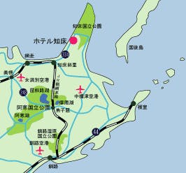 ■飛行機 最寄空港:女満別空港・中標津 JAL・ANA・AIRDO・PEACHが就航。各航空会社HPより 詳細をご確認下さい。 (中標津空港はANAのみ) ■JR・バス ※バスをご利用の方は下記ルートが一般的です。 (バス)女満別空港⇒網走駅 (JR)網走駅⇒知床斜里駅 (バス)知床斜里駅⇒ウトロバスターミナル JR網走駅―JR知床斜里駅 40分 JR釧路駅―JR知床斜里駅 2時間15分 ※知床斜里駅よりウトロバスターミナル 路線バス50分 ■お車 女満別空港より車で網走市街地経由で約120分 中標津空港より斜里町市街地経由で約150分 網走市街地―ホテル知床 1時間30分(R244斜里経由) 釧路市街地―ホテル知床 3時間20分(R241標津経由) JR知床斜里駅―ホテル知床 40分(R334ルート)