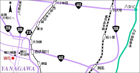 ■西鉄柳川駅より タクシー・・・約10分/川下り・・・約70分 ■航空機利用 佐賀空港からリムジンタクシーで30分 福岡空港から約1時間半(西鉄電車で柳川へ) ■JR利用 西鉄大牟田線柳川駅下車タクシー約10分 ■お車利用 自動車利用 九州自動車道八女ICより国道209号線県道443線約20キロ約30分